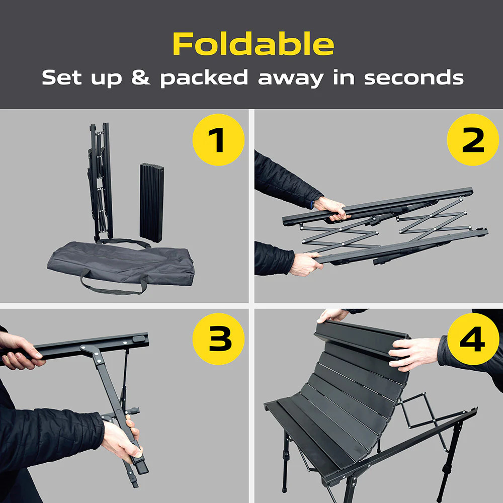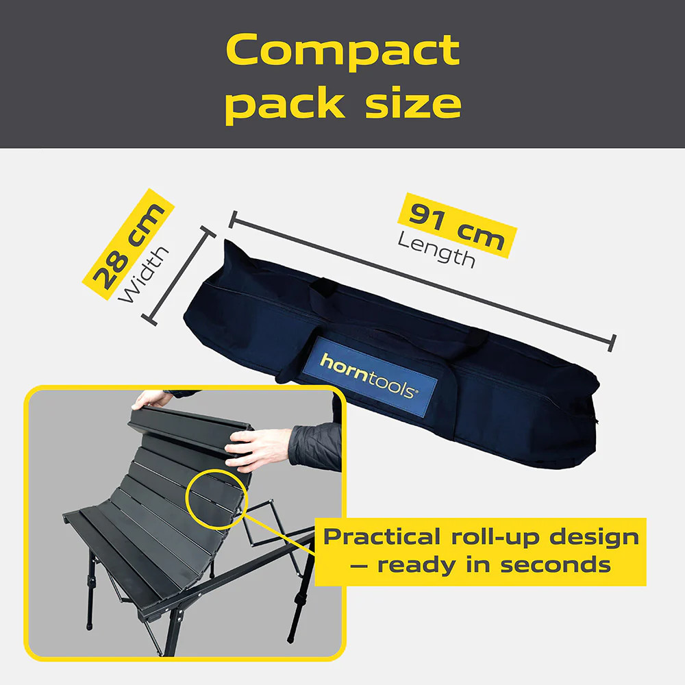 Rám se složí a deska stolu se jednoduše sroluje. Stůl se dá sestavit a složit během několika sekund. Díky kompaktním rozměrům se snadno vejde do dodané přepravní tašky.