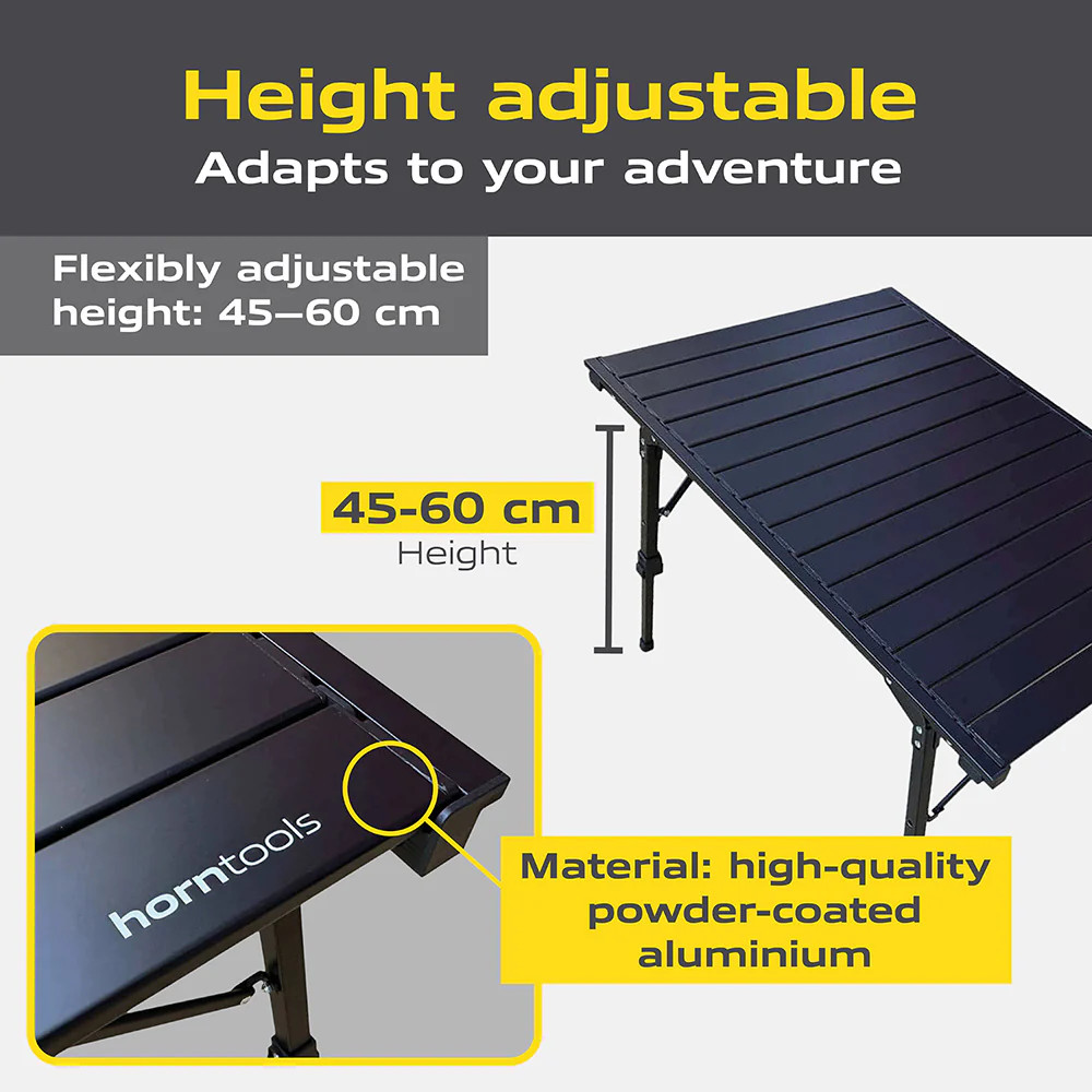 Hliníková deska stolu je robustní a snadno se čistí. Po kempování stačí jen rychlé otření – více času na přírodu a dobrodružství, méně času na péči.