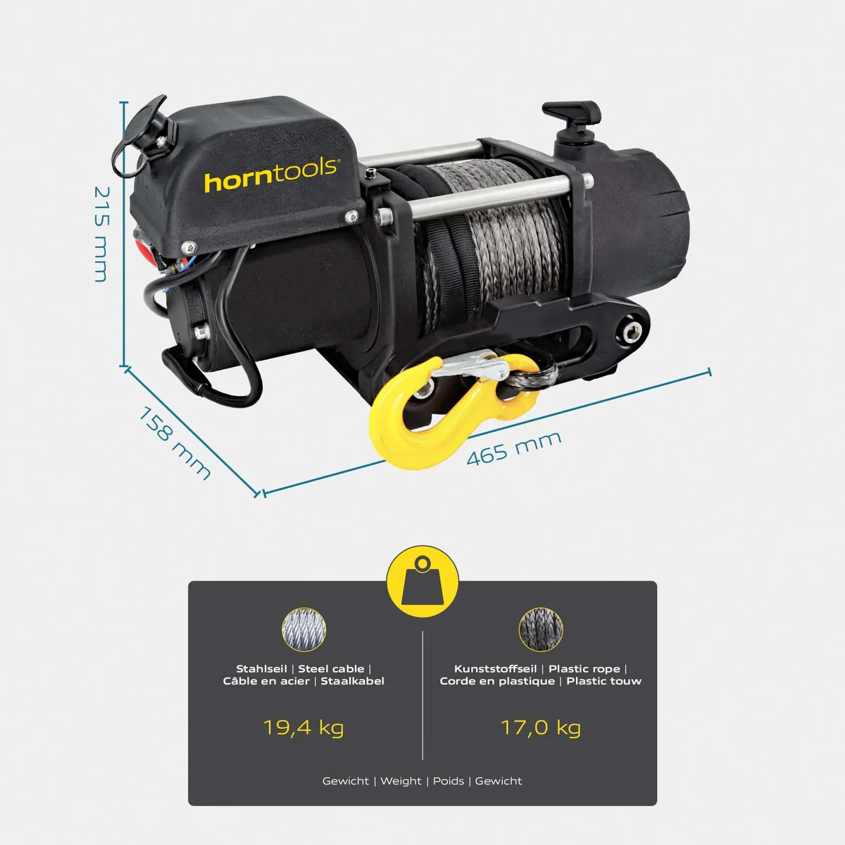 - Hmotnost navijáku s ocelovým lanem: 19,4 kg
