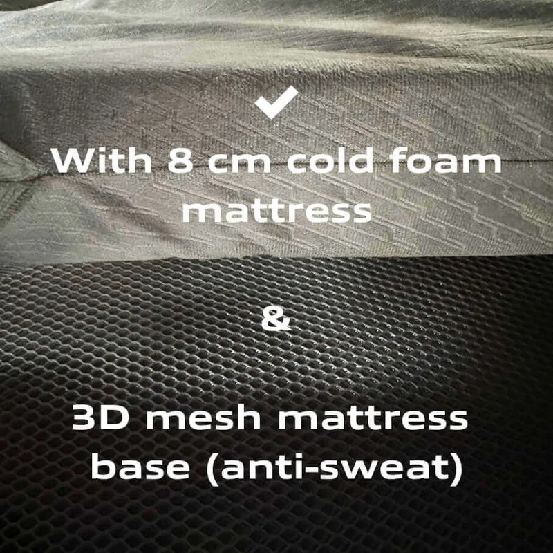 Matrace ze studené pěny/paměťové pěny o tloušťce 8 cm v kombinaci s 3D síťovanou podložkou proti pocení zajišťuje vyvážené klima pro spaní – ideální pro dvě až tři osoby, které jsou pryč několik nocí v kuse.